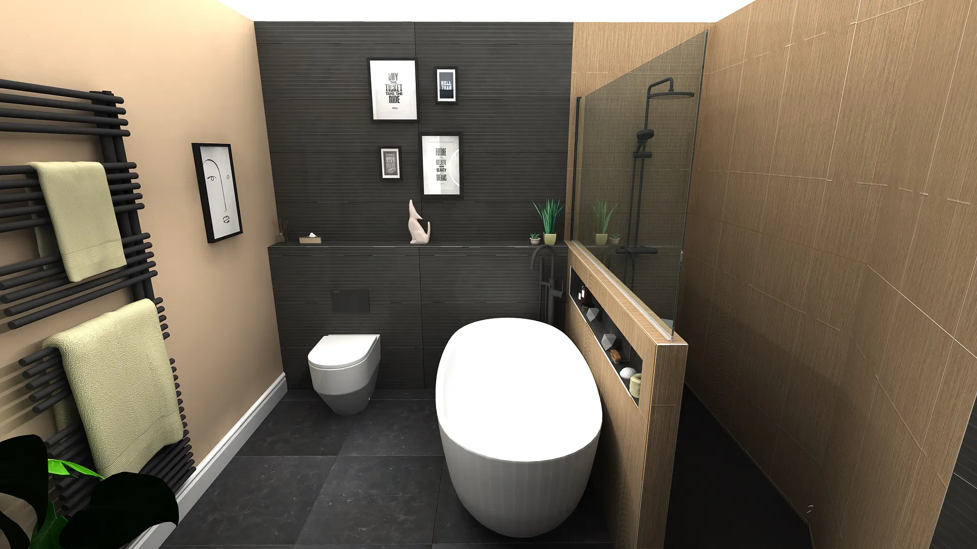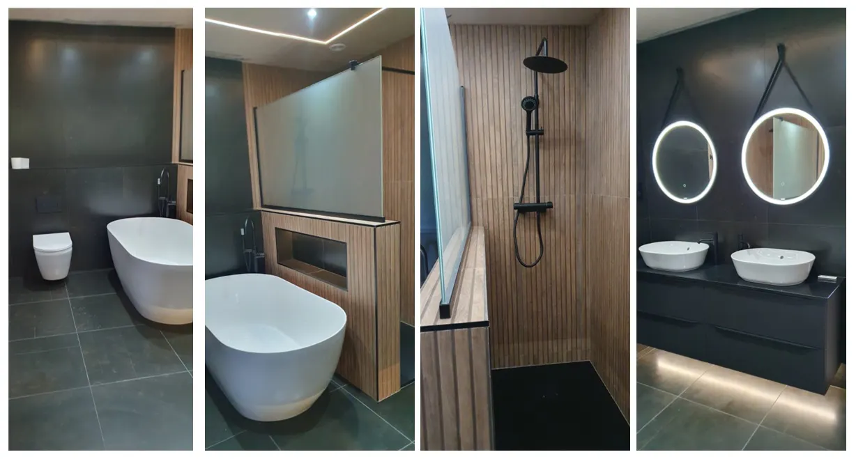 The feature area in the shower and around the bath was finished with large Cognac wood-effect tiles, adding warmth and texture to balance the darker tones. The room was completed with matching illuminated mirrors, recessed feature lighting, and a complementary black towel radiator.
