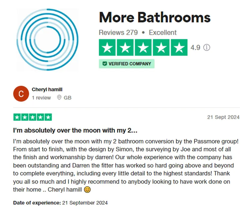 "I’m absolutely over the moon with my 2-bathroom conversion by the Passmore Group! From start to finish, with the design by Simon, the surveying by Joe and most of all the finish and workmanship by Darren! Our whole experience with the company has been outstanding and Darren the fitter has worked so hard, going above and beyond to complete everything, including every little detail to the highest standards! Thank you all so much and I highly recommend to anybody looking to have work done on their home."