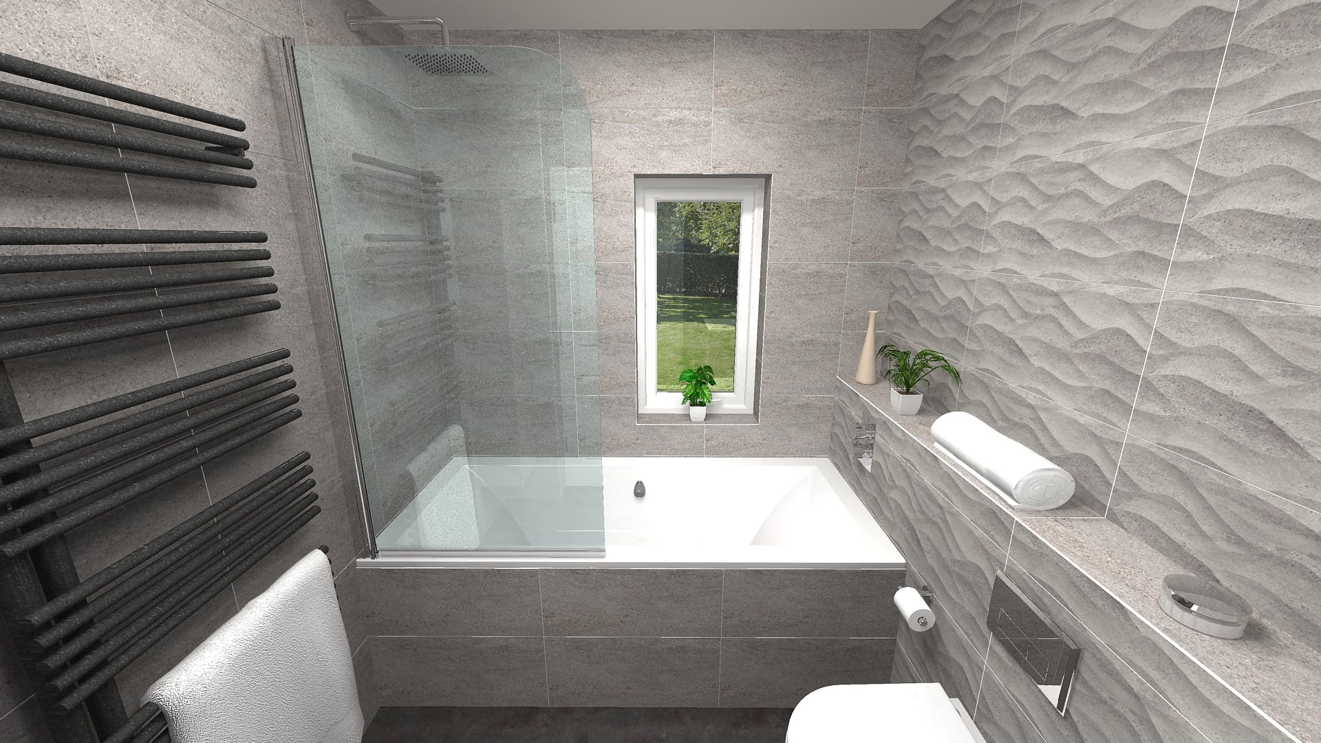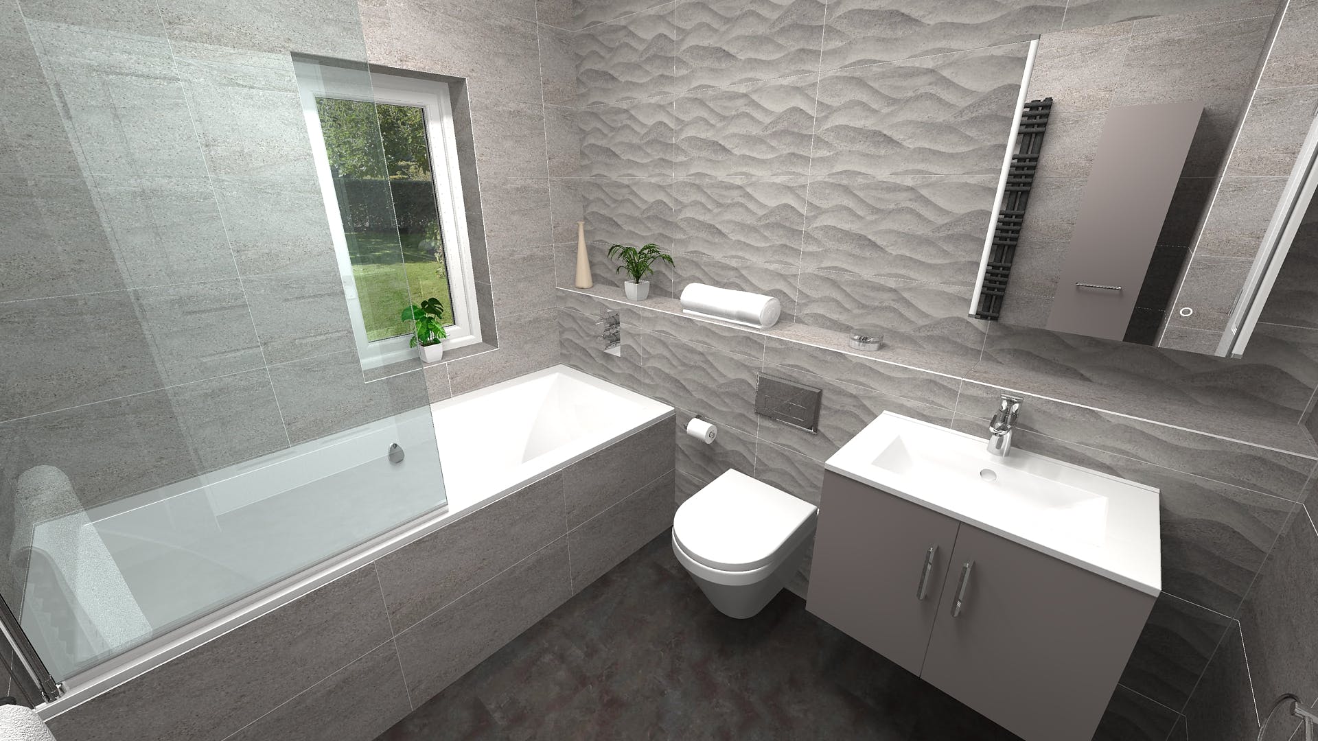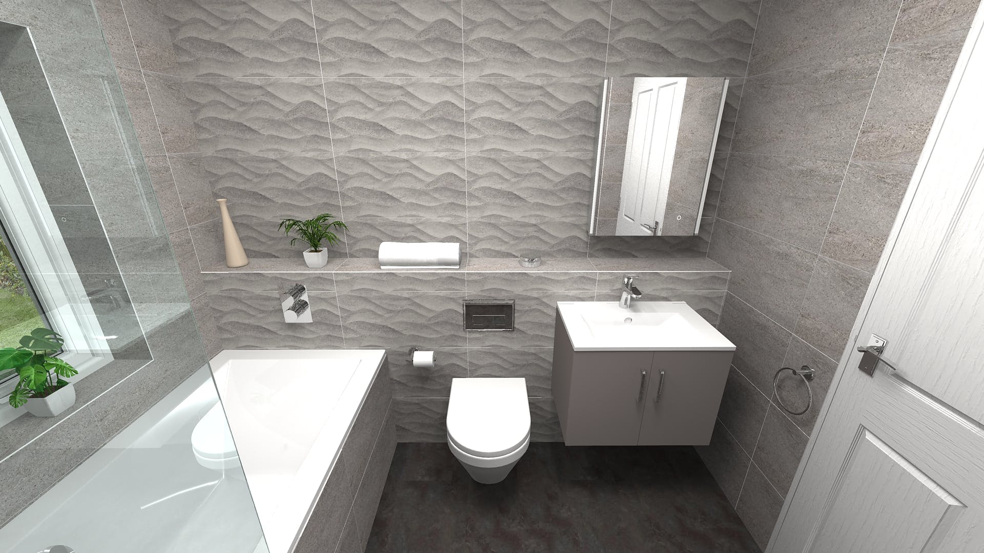 To create a streamlined, contemporary look, the walls were fully tiled in Madagascar light grey tiles. A striking feature tile was applied along the main fixture wall, adding visual depth and interest to the scheme. To achieve a flawless finish, a purpose-built stud wall was constructed along this same run, concealing pipework and allowing for a seamless backdrop.