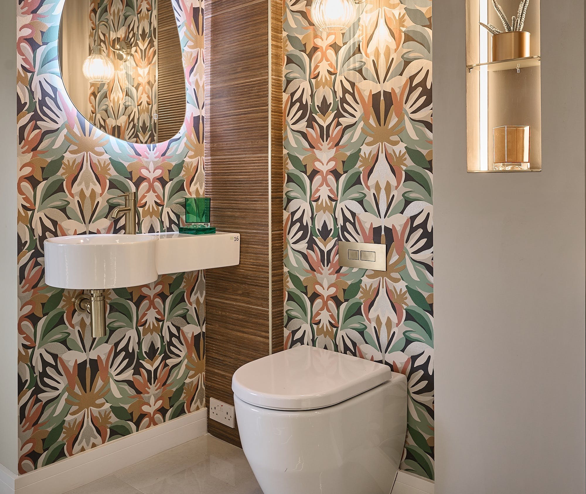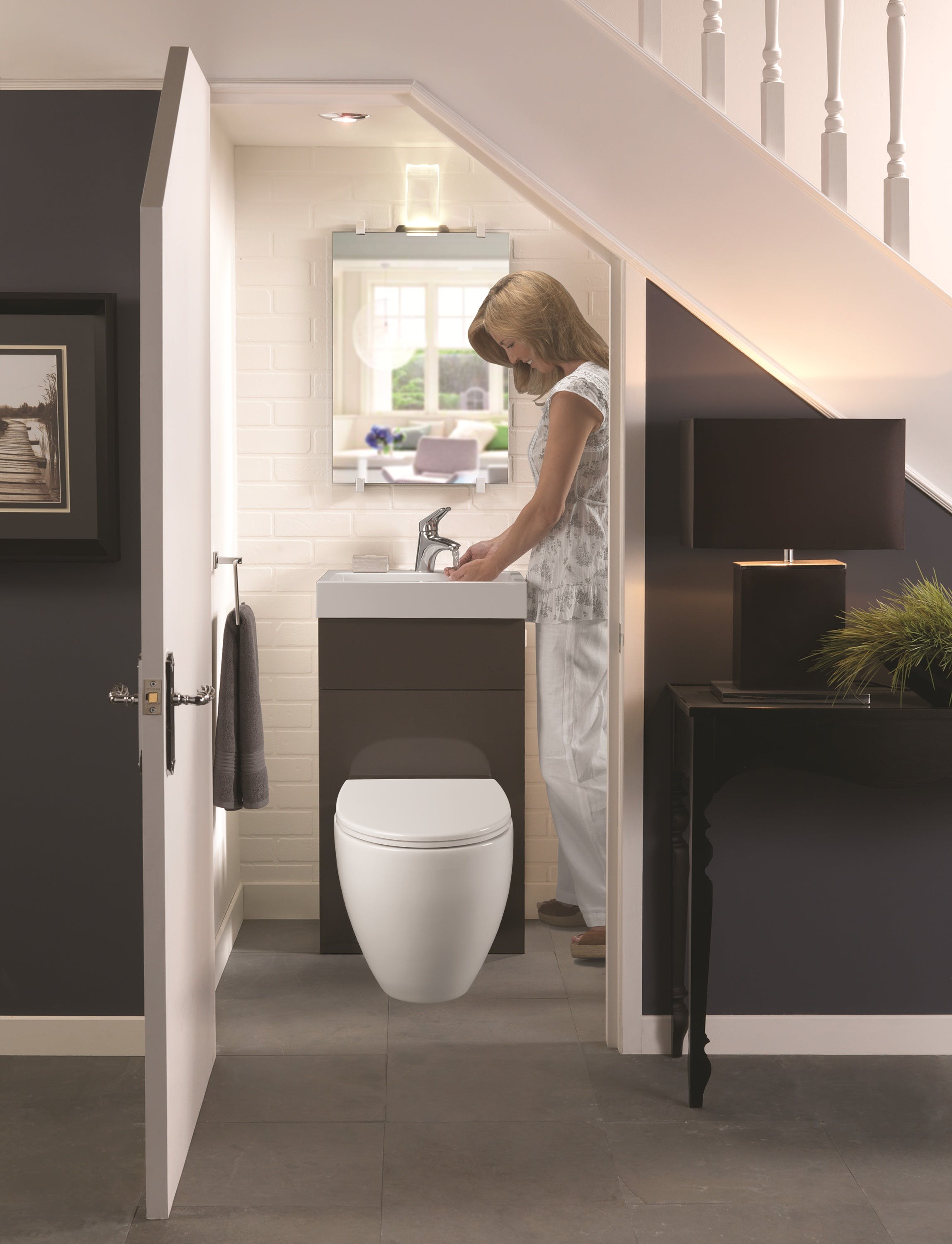 Wall-hung toilets and sinks clear floor space and create a modern look. Matching taps, towel rails and mirrors can tie the look together, particularly in smaller environments where consistency counts. Stylish mirrors also reflect light and enhance depth, especially useful under a staircase where natural light may be limited or, more likely than not, non-existent. Consider layering functional light with decorative lighting above mirrors or inside niches for added character.